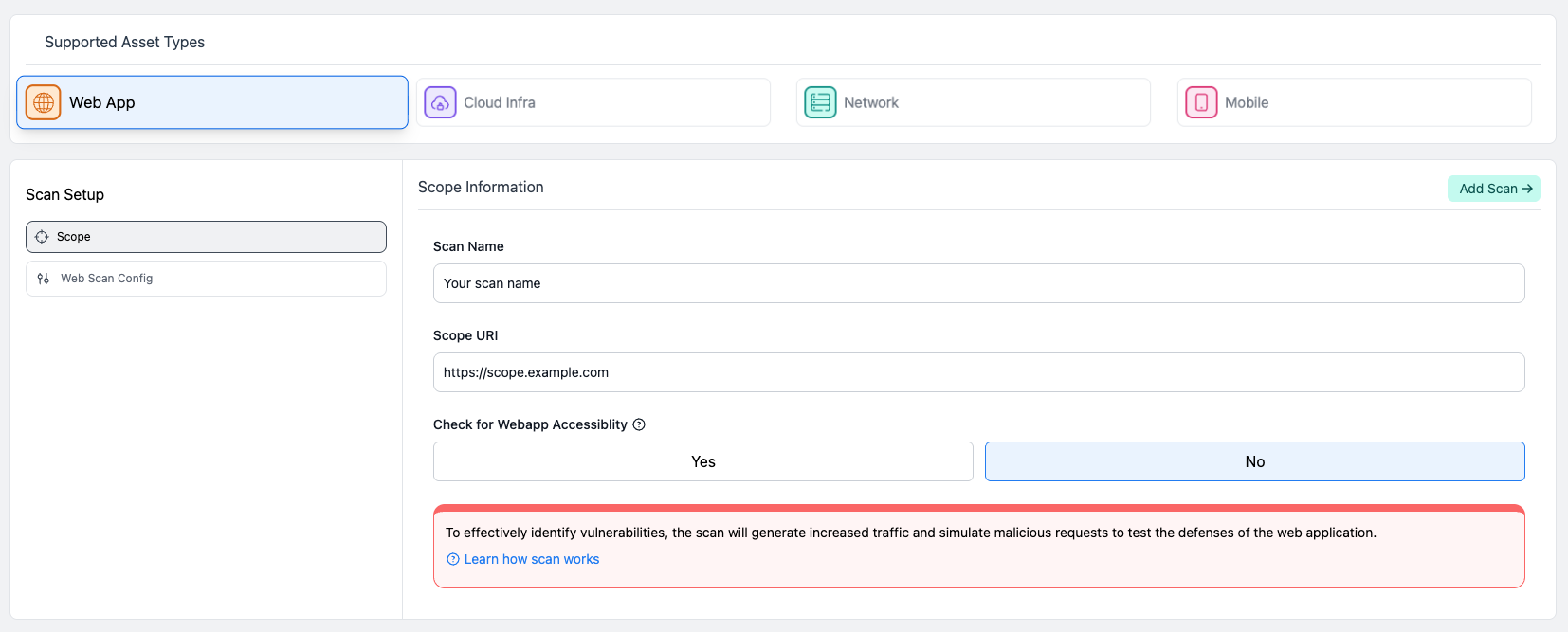 ⚠️ Important: Make sure the URL is accurate and final. The scope URL cannot be changed after the scan is created.