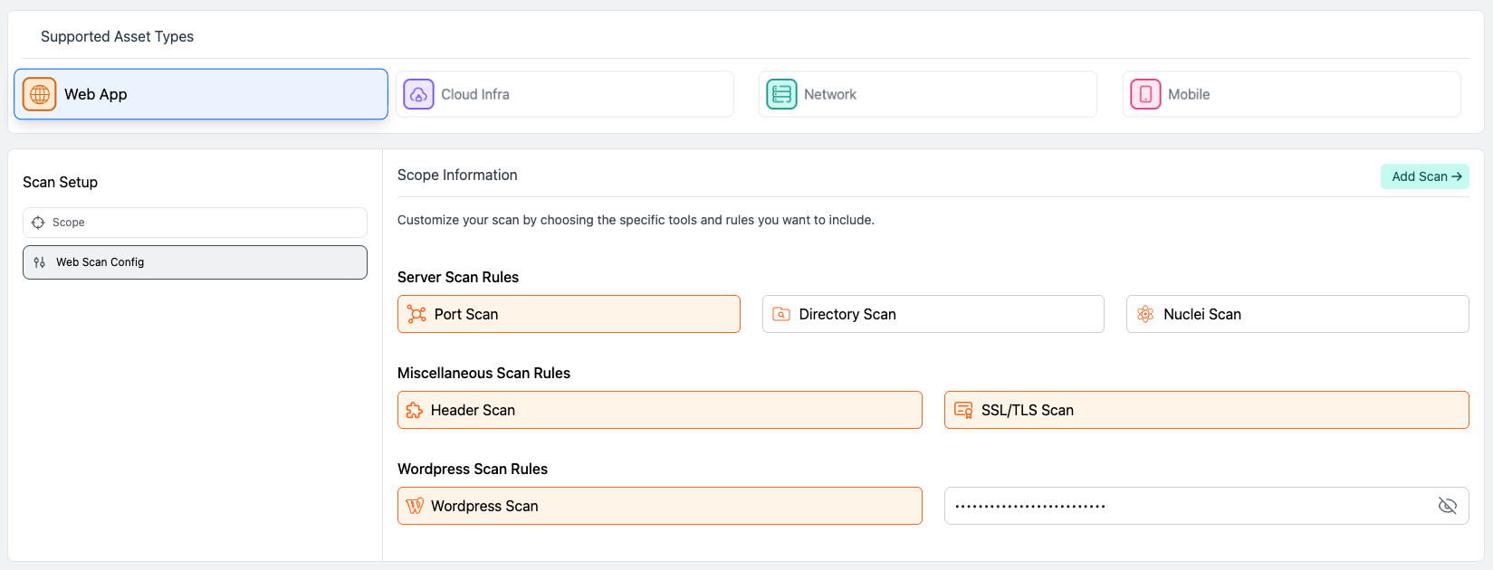 Select Web App as your asset type and define your scope by entering a scan name and the target URL. This ensures Chowkidar runs web-specific tools and vulnerability checks tailored for web applications.